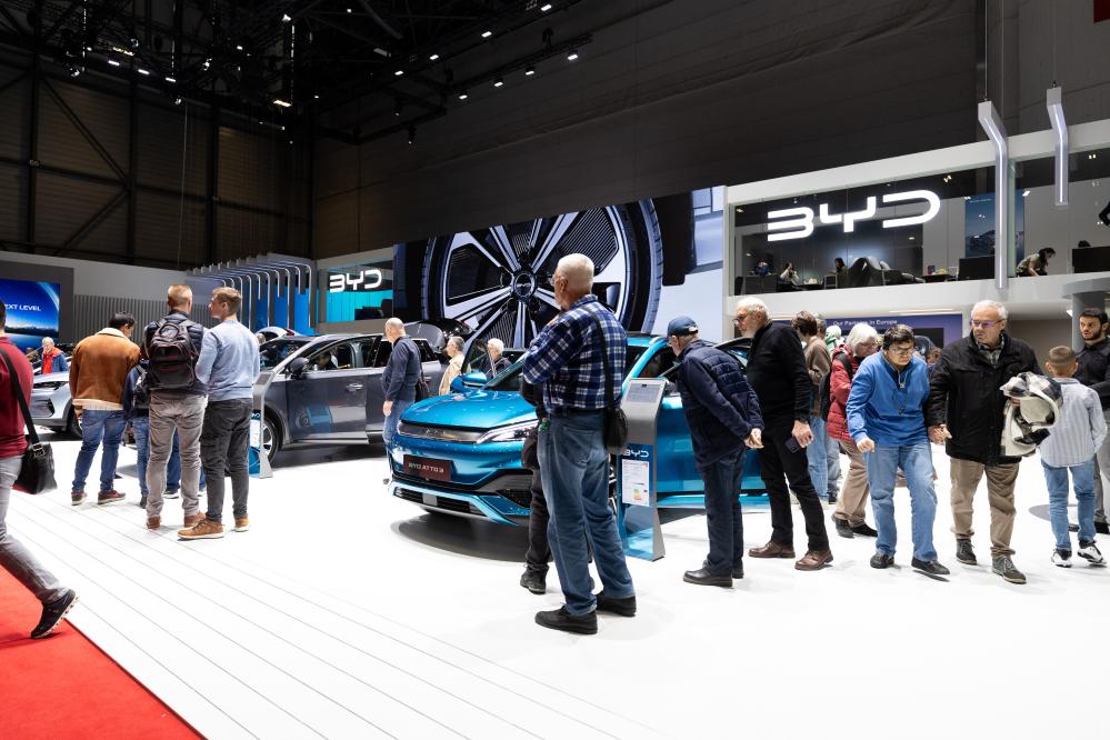 這是2月28日在瑞士日內(nèi)瓦舉行的2024年日內(nèi)瓦國際車展上拍攝的比亞迪展臺。新華社記者孟鼎博 攝