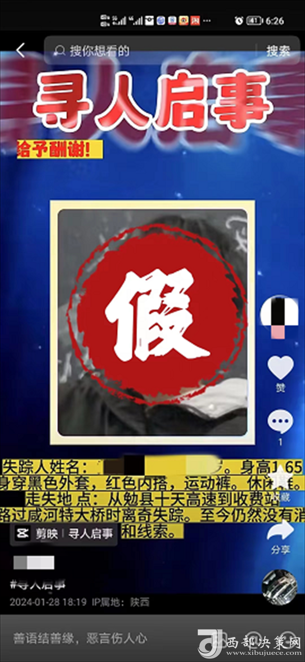 2024年1月28日晚,網民周某因與同學黃某在網上聊天過程中發(fā)生口角。周某為發(fā)泄情緒報復黃某,在短視頻平臺使用黃某照片,編造黃某在勉縣十天高速與咸河大橋之間走失至今沒有線索的謠言,此網絡謠言造成不良社會影響。